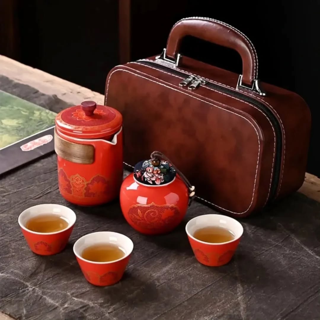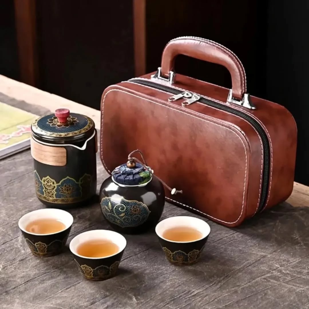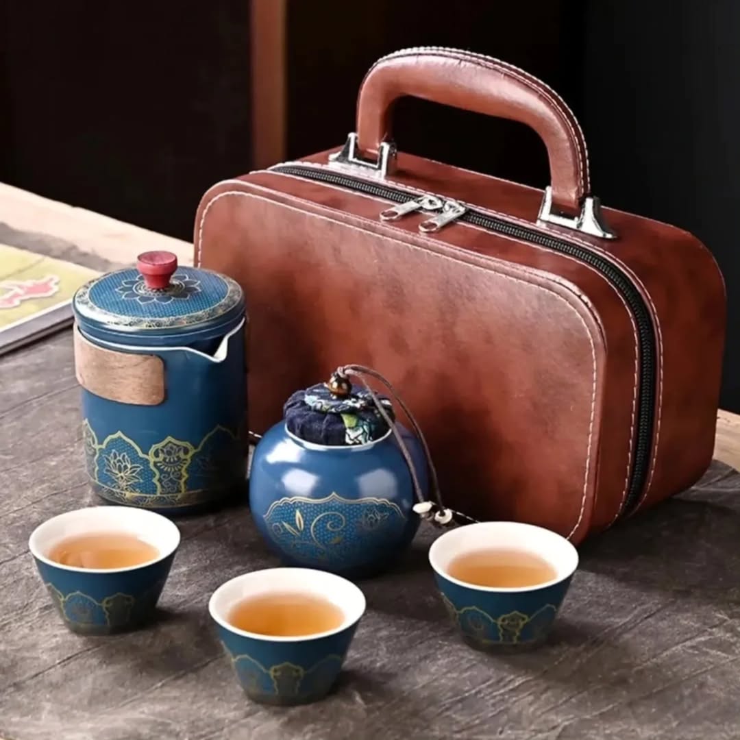 ست چایخوری مسافرتی سهنفره سرامیکی با کیف چرمی ضدآب