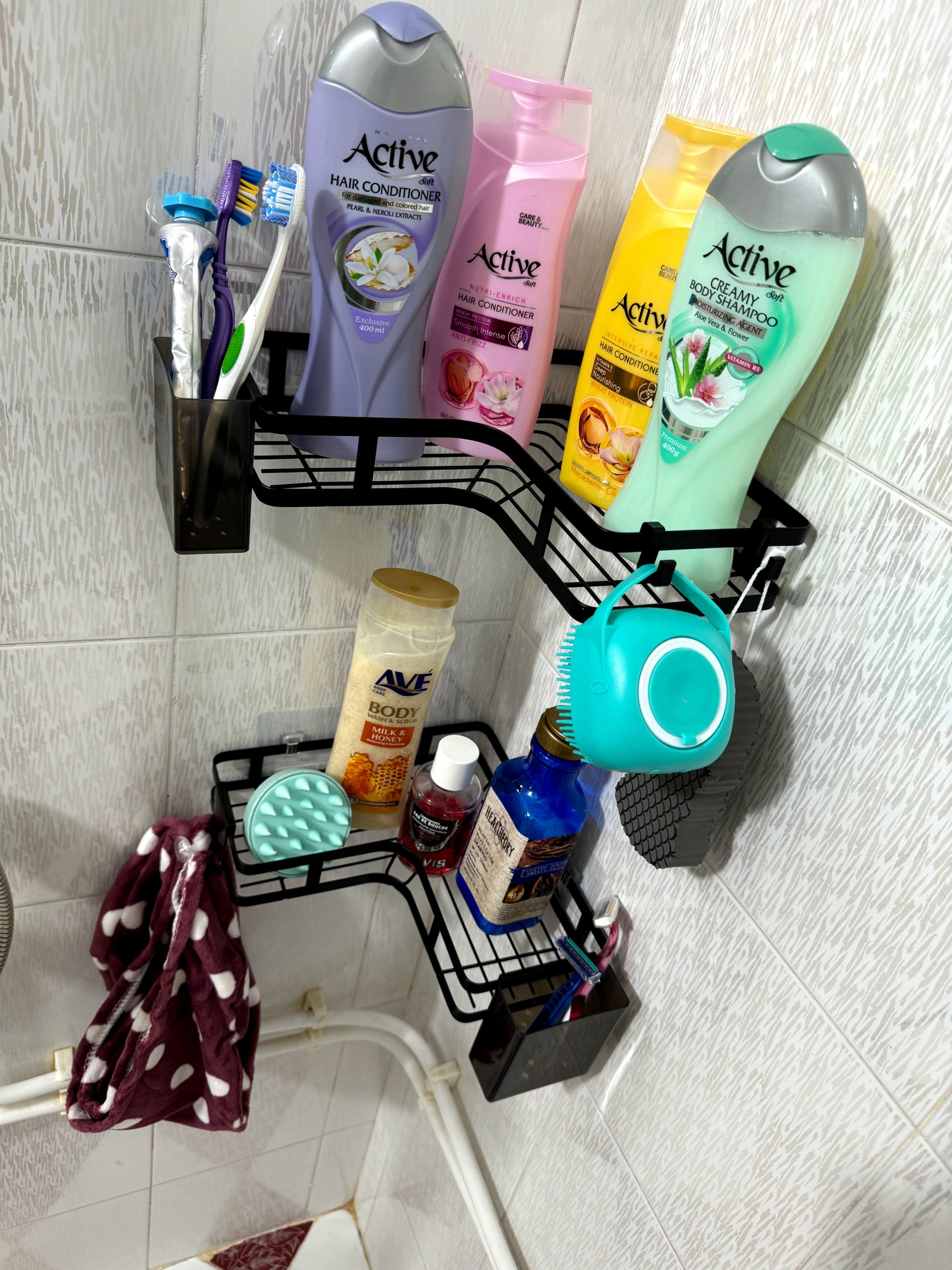 ✔️دارای دو عدد شلف کنج دیواری مخصوص جاشامپو و… که سایز کف آن ۴۰ سانت است می باشد